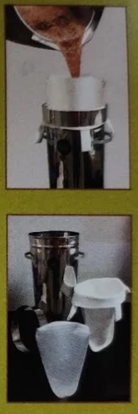 Slowly pour HOT maple syrup into your filtering system so that the maple syrup will travel through the Cone Pre-Filters and then exiting through the bottom of the bottom of the main Orlon Filter Bag. ( VERY IMPORTANT : hot syrup will flow through the filters much better and faster then cooler syrup…. Be sure syrup temperature stays between 180 and 200 F)