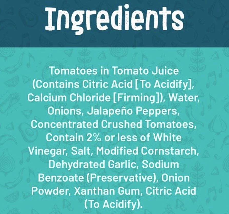 Tomatoes In Tomato Juice (Contains Citric Acid, Calcium Chloride), Water, Onions, Jalapeno Peppers, Concentrated Crushed Tomatoes, Contains 2% Or Less Of White Vinegar, Salt, Modified Cornstarch, Dehydrated Garlic, Sodium Benzoate (Preservative), Onion Powder, Xanthan Gum, Citric Acid.