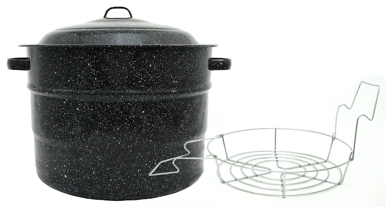 Enjoy your favorite fruits and vegetables throughout the year. This canner includes a 21.5 qt. canner with side handles, a lid and jar rack. This durable porcelain on steel pot heats quickly and efficiently; saving energy. The versatile jar rack holds: 7 – quart jars, 9 – pint jars or 13 – half pint jars and is dishwasher safe.