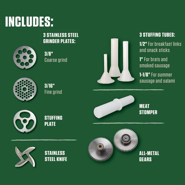 All stainless steel motor housing, all metal gears with roller bearings, heavy duty handle for easy moving, 110 volt, permanently lubricated motor with improved grease formulation to reduce motor noise, built-in circuit breaker, stainless steel knife, head, auger and large meat pan, stainless steel coarse (3/8″) and fine (3/16″) plates, 3 stuffing tubes (1/2″, 1″, 1-3/8″ OD), and meat stomper.