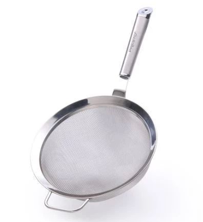 The Presto 8-in.Stainless Steel Mesh Strainer features a brushed stainless steel handle and a sturdy resting loop for hands-free support on sinks, bowls, or pots.. It’s also dishwasher safe for easy clean-up.