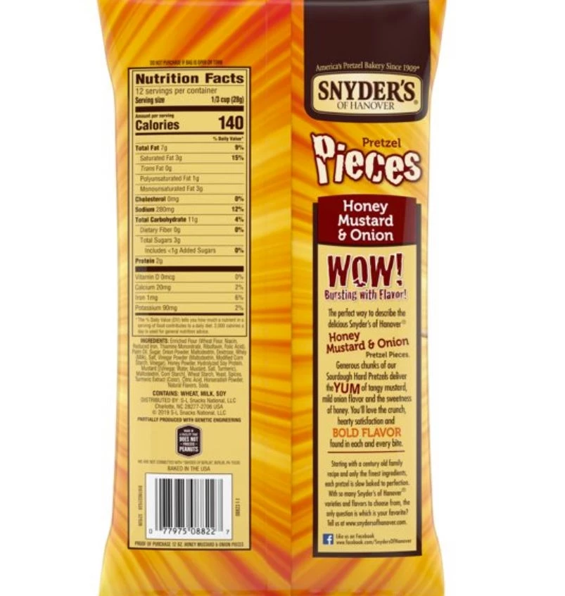 Snyder’s of Hanover Pretzel Pieces are Sourdough Hard Pretzels baked to perfection then broken into generous chunks and coated with Honey Mustard & Onion Seasoning. They are bursting with intense flavor and delicious crunch for the perfect snack. And they’re a baked alternative to potato chips with 0g trans fat, no MSG, and made in a facility that does not process peanuts. You’ll love these crunchy pretzel pieces as a lunch snack or school snack.