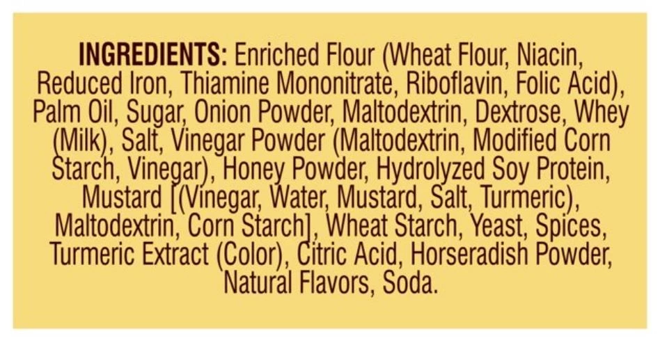 Ingredients: Enriched Flour (Wheat Flour, Niacin, Reduced Iron, Thiamine Mononitrate, Riboflavin, Folic Acid), Palm Oil, Sugar, Onion Powder, Maltodextrin, Dextrose, Whey (Milk), Salt, Vinegar Powder (Maltodextrin, Modified Corn Starch, Vinegar), Honey Powder, Hydrolyzed Soy Protein, Mustard [(Vinegar, Water, Mustard, Salt, Turmeric), Maltodextrin, Corn Starch], Wheat Starch, Yeast, Spices, Turmeric Extract (Color), Citric Acid, Horseradish Powder, Natural Flavors, Soda. Contains: Wheat, Milk, Soy.