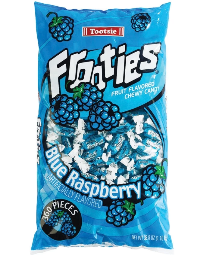 Tootsie Frooties® Blue Raspberry flavored chewy candy. Peanut Free. Packed 360 pcs (38.8 oz) in bag.